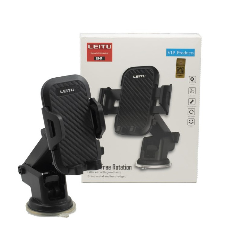 پایه نگهدارنده گوشی موبایل LEITU مدل LR-14 با گیره های کشویی بسیار قوی قابلیت چسبندگی برروی هر سطح صاف جلویی اتومبیل، میز کار و غیره را خواهد داشت. جنس بدنه این هولدر از سلیکون بوده و در قسمت گیرهای از پوشش سیلیکون برای جلوگیری از لیز خوردن گوشی موبایل استفاده شده است. با استفاده از هولدر موبایل ذکر شده امکان چرخش 360 درجه و یا قرار گرفتن در حالت عمودی و افقی امکان پذیر میباشد، که در هنگام رانندگی آسودگی خاطر بالایی برای راننده فراهم میآورد.